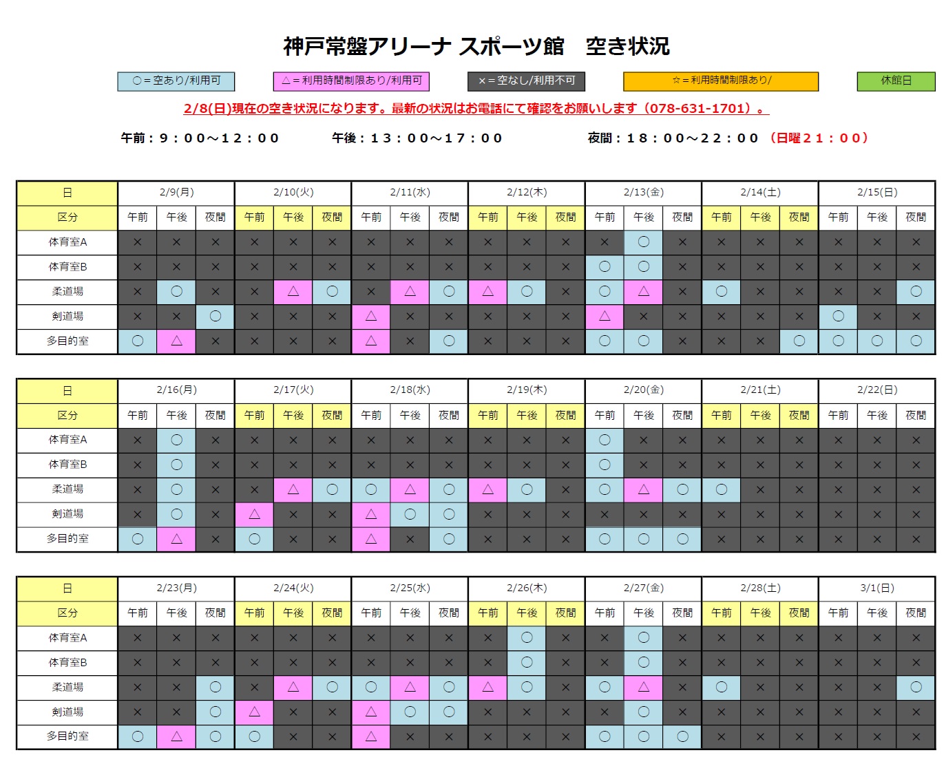 予約ご希望の枠がありましたら 神戸常盤アリーナ ☎078-631-1701 までお問い合わせください。