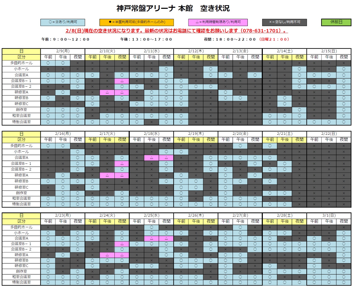 2026年2月9日(月)から2026年3月1日(日)の施設空き状況をお知らせします。