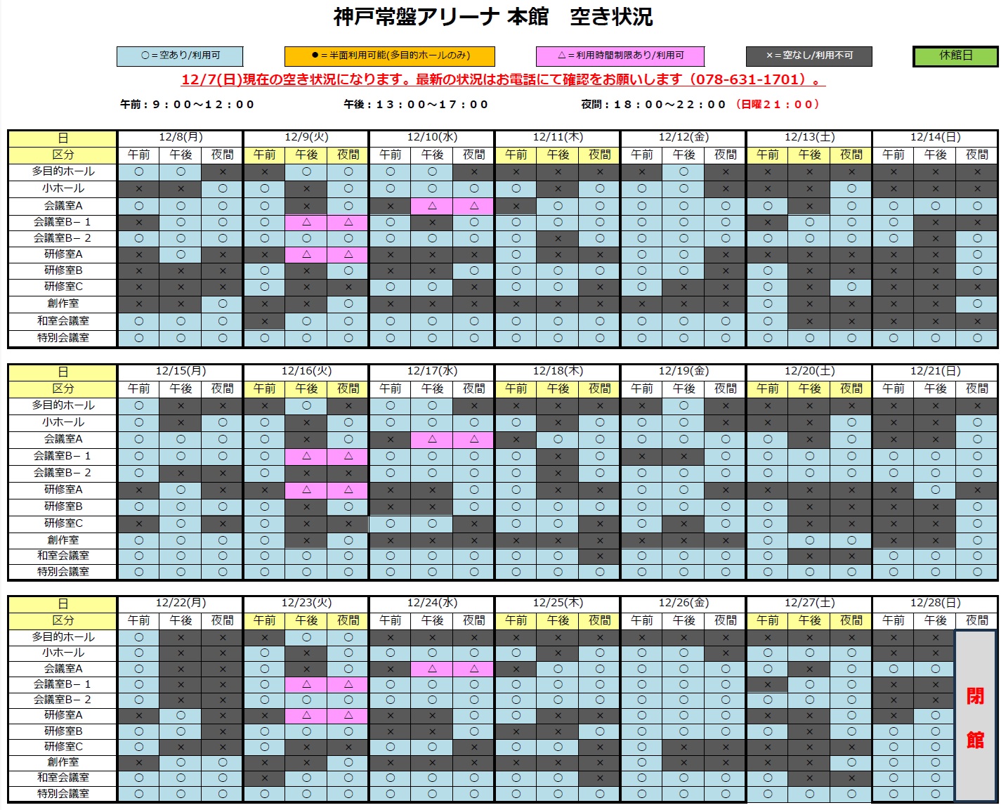 2025年12月8日(月)から2025年12月28日(日)の施設空き状況をお知らせします。