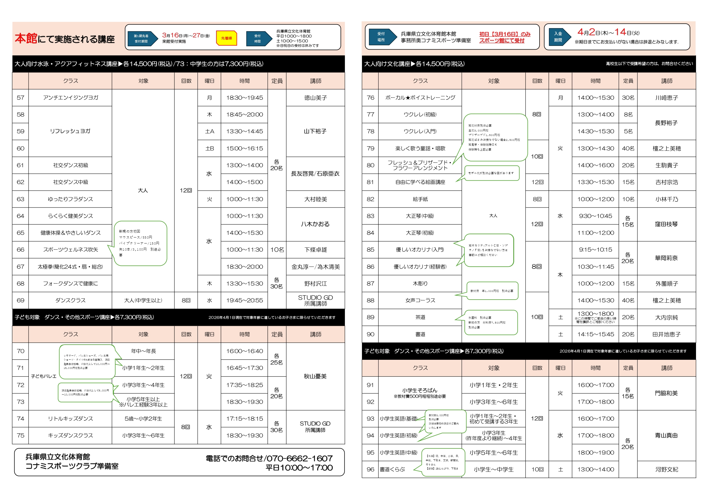 ※3月22日以降は本館コナミスポーツ準備室にて受付します。
